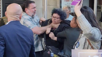 A heavy-set white man brutally attacked a conservative woman of color at a sidewalk rally for Gov. Kathy Hochul. Watch…
