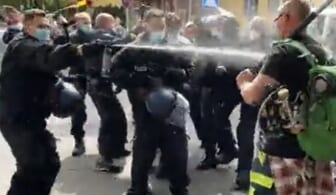 Shocking footage shows police in Berlin, Germany using physical force, batons, and pepper spray against citizens protesting coronavirus restrictions.