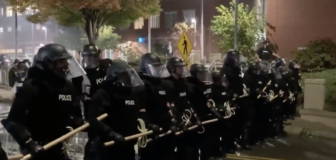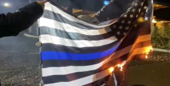 Portland protester holding a burning Blue lives matter flag in front of Portland police at the Kelly Penumbra building. #Portland…