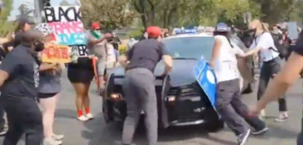 An anti-Trump thug in Sacramento jumped atop a police vehicle but was quickly thrown off when the driver sped away.…