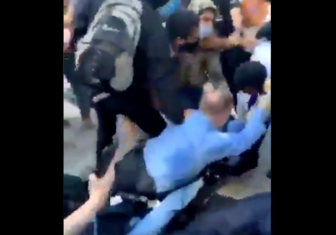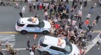 Police officers drove their vehicles through a crowd of rampaging rioters that had blocked their path on a New York…