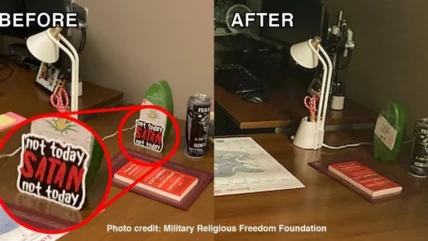 The Veterans Benefits Administration ordered a Christian staffer to remove a plaque from her desk that read, “Not Today, Satan.…