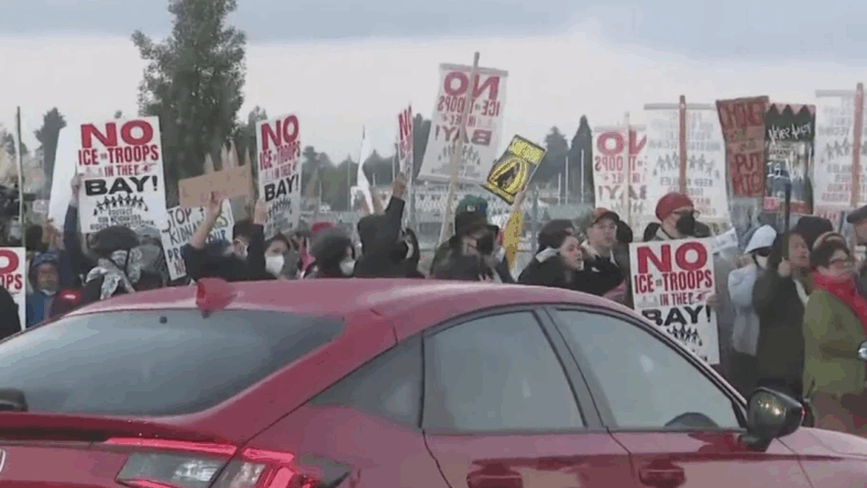 Protesters began to arrive at Coast Guard Island around 6 a.m., blocking the entrance to the island. Shortly after 7 a.m., a CBS News Bay Area crew spotted a Coast Guard vehicle drive past the crowd and then fire flash bangs and smoke grenades to disperse it.